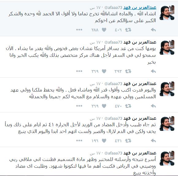 واختتم تغريداته: “واليوم قدرت اكتب وأقول قدر الله وما شاء فعل، والله يحفظ ملكنا وولي عهد المسلمين وولي عهده، يومها كنت من غد بسافر أميركا عشان بعض فحوص، والله يقدر ما يشاء، الآن سمحوا لي في السفر لأجل هناك مركز متخصص بذلك والله يكتب الخير وأنا بخير، والمادة إن شاء الله تخرج تمامًا ولا أقول إلا الحمد لله وحده والشكر الكبير على سؤالكم عن أخوكم”.