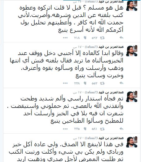 وأكمل: “وسألت هل هو مسلم؟ قيل لا قلت اتركوه وعطوه كتب بلغته عن الدين وشرهه. وأصريت. لأني حمدت الله أنه كافر، وأعطيتهم تحليل بول أكرمكم الله لأنه أسرع نتيجة وأرسلته للمختبر وظهرت مادة التسمم فظننت أني ملاقي ربي ووصيتي في الرياض فكتبت أهم ما فيها لتكونوا شهود، وطلبت أي مضاد وأخذته”.