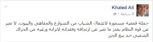 وقال خالد علي -في منشور على حسابه الشخصي بموقع التواصل الاجتماعي “فيس بوك”، اليوم الجمعة-: “حملة قمعية مسعورة لاعتقال الشباب من الشوارع والمقاهي والبيوت، لا تعبر عن قوة النظام بقدر ما تعبر عن ارتجافه وفقدانه لاتزانه ورعبه من الحراك الشعبي ضد بيع الجزر”.