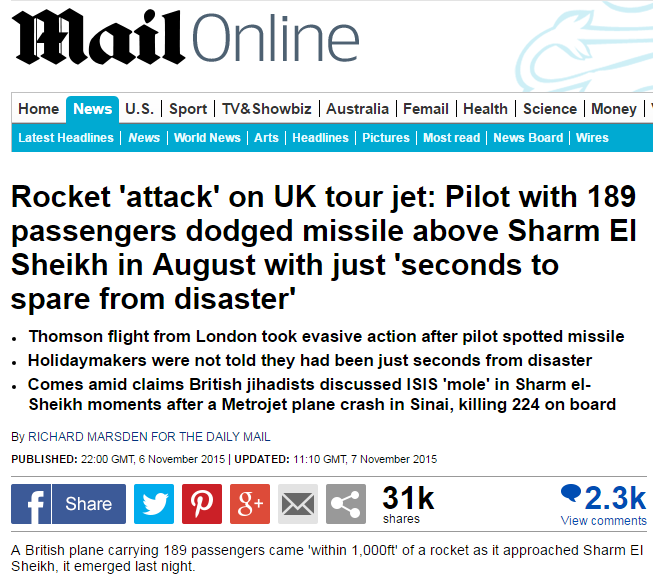 هاجمت وزارة الخارجية المصرية أيضًا صحيفة الديلي ميل، بعدما نقلت الصحيفة عن أحد مصادرها أن طائرة بريطانية كانت تحلق بواسطة مساعد الطيار، بينما تواجد قائد الطائرة داخل قمرة القيادة، ورصد هجوم الصاروخ ناحية الطائرة، وأمر مساعده بالانحراف يسارا على الفور من أجل تفادي الضربة.