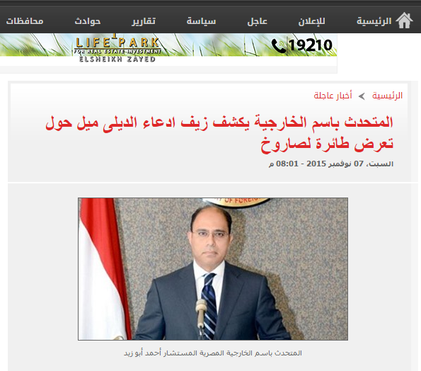 وقال أبو زيد -عبر صفحته الخاصة بموقع التواصل الاجتماعي بتويتر- أإ الواقعة متعلقة بتدريب أرضي-أرضي في قاعدة عسكرية على بعد كيلومترات قليلة من مطار شرم الشيخ، ولم يكن هناك إطلاق نار أرضي -جوي بالمرة، موضحا أن حكومات مصر وبريطانيا واعية تماما بأن الطائرة لم تكن بخطر، والطائرات تم إبلاغها مسبقا بالتدريب العسكري وكان لديها تعليمات بالإجراءات.