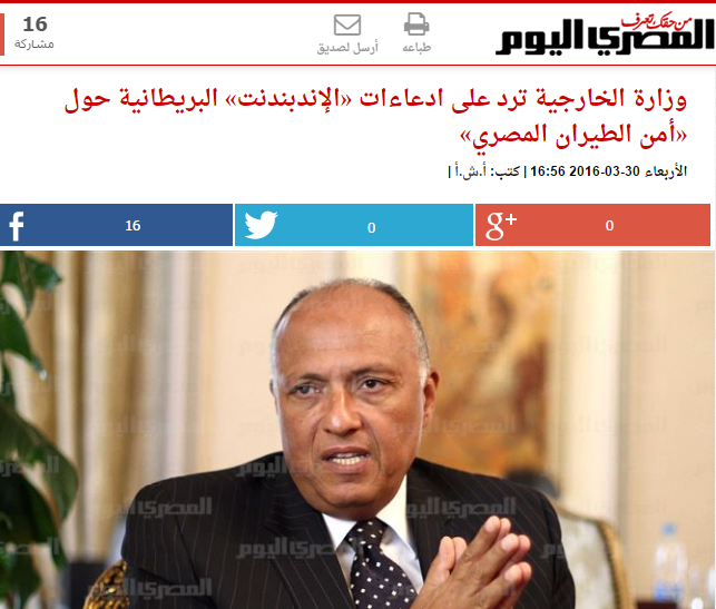 وأعرب المتحدث الرسمي باسم وزارة الخارجية المستشار أحمد أبوزيد عن رفضه ما وصفه بادعاء صحيفة “الإندبندنت” البريطانية بأن حادث اختطاف الطائرة التابعة لمصر للطيران بالأمس، يضع أمن الطيران في مصر “تحت التدقيق المتزايد”، واصفًا ما ذكرته الجريدة بأنه أمر مثير للتعجب والحيرة.