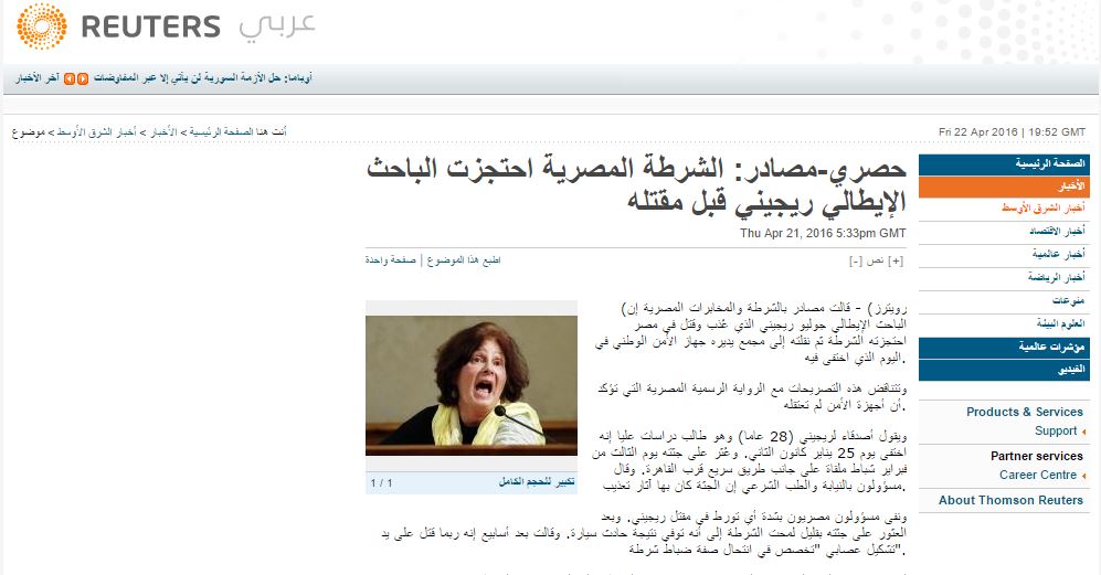 ونقلت وكالة “رويترز” للأنباء عن مصادر أمنية ومخابراتية أن الشاب الإيطالي، الذي عثر عليه قتيلا في فبراير الماضي، تم احتجازه في قسم شرطة “الأزبكية” بوسط القاهرة، ثم تم نقله إلى مجمع يديره جهاز الأمن الوطني في 25 يناير 2016م، وهو اليوم الذي اختفى فيه، وذلك في تناقض مع الرواية الرسمية المصرية التي تؤكد أن أجهزة الأمن لم تعتقله.