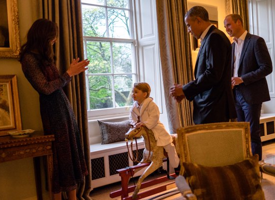 وظهر أوباما في الصور، وهو يجلس القرفصاء خلال حديثه مع الأمير الصغير، قبل أن يصطحبه للعب على حصان خشبي كان أوباما أهداه إياه عند ولادته عام 2013.