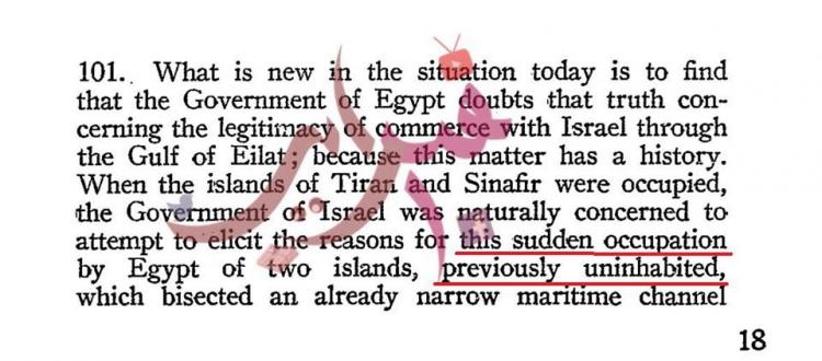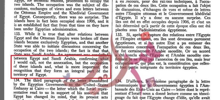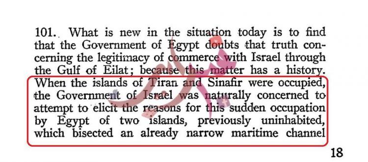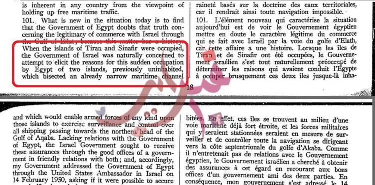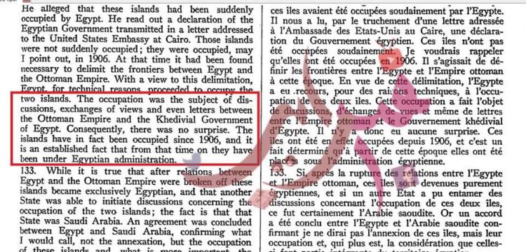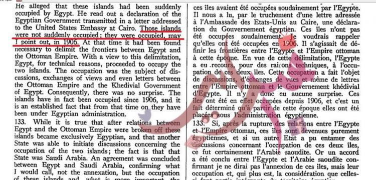 كما استند الشيخ إلى محضر لمجلس الأمن في فبراير 1954، والذي يقول فيه مندوب إسرائيل: “مصر سيطرت بشكل مفاجئ على الجزيرتين التي كانتا مهجورتين من قبل”، مشددًا على ما قاله المندوب الإسرائيلي الذي قال بأن الجزيرتين كانتا مهجورتين، ولم يقل بأنهما كانتا تحت السيطرة السعودية.