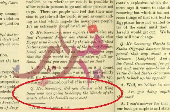 وثيقة رسمية من الخارجية الأمريكية: سؤال لوزير الخارجية الأمريكي عام 1957 إذا ما كانت الولايات المتحدة تشاورت مع السعودية بشأن السيطرة على الجزيرتين في أعقاب انسحاب اسرائيل بعد العدوان الثلاثي.