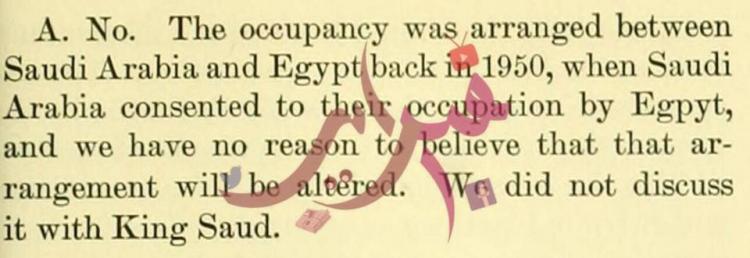 وتطرقت وثائق الشيخ إلى موقف وثقته وزارة الخارجية الأمريكية عام 1957، حينما سئل وزير الخارجية الأمريكي ما إذا كانت واشنطن ناقشت مع الملك سعود من سيسطر على الجزيرتين بعد انسحاب إسرائيل في نهاية العدوان الثلاثي، فجاء رده، وفق الوثائق: “السعودية وافقت على سيطرة مصر على الجزيرتين 1950، ولا يوجد سبب للاعتقاد أن هذا الاتفاق سيتغير، وبالتالي لم نبحث ذلك مع الملك سعود”.
