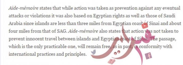 وفي الجزء الذي قال فيه البرادعي: “جزر تيران وصنافير تقع تحت “السيطرة” المصرية منذ عام 1950 بينما تدعى السعودية ملكيتهما مؤكدة أنهما يقعان داخل المياه الإقليمية السعودية، في حين أن مضيق تيران والذى يقع بين الجزيرة وشاطئ سيناء هو واقع داخل المياه الإقليمية المصرية وهو الممر الحيوي الذى يستخدم في الملاحة”.