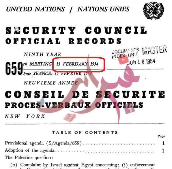 صورة من محضر جلسة مجلس الأمن يوم 15 فبراير 1954: المندوب الإسرائيلي يقول إن مصر سيطرت على الجزيرتين بشكل مفاجئ وإنهما كانتا مهجورتين من قبل.