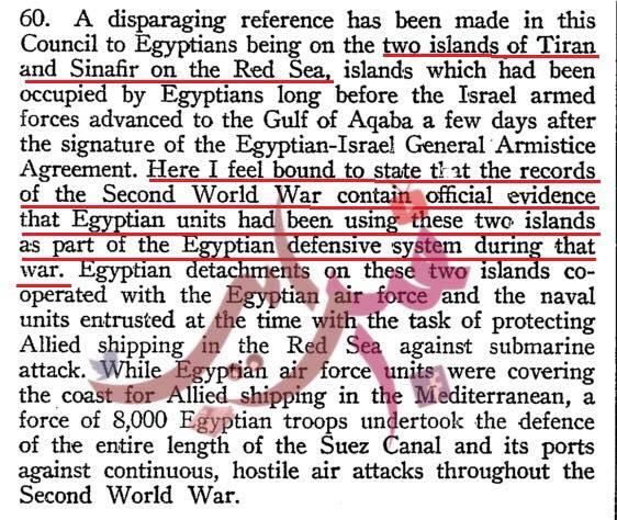 من محضر جلسة مجلس الأمن يوم 15 فبراير 1954: المندوب المصري يقول إن القوات المصرية كانت متمركزة في الجزيرتين خلال الحرب العالمية الثانية.