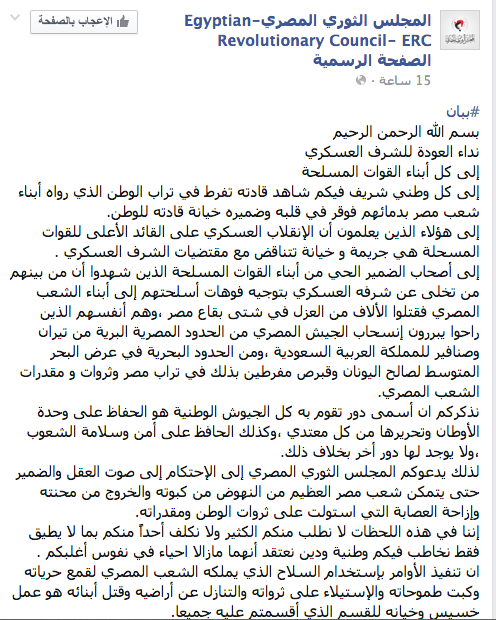 وجَّه المجلس الثوري المصري نداءً إلى أبناء القوات المسلحة، اليوم، تحت شعار "نداء العودة للشرف العسكري"، قال فيه "إلى كل وطني شريف فيكم شاهد قادته تفرط في تراب الوطن الذي رواه أبناء شعب مصر بدمائهم فوقر في قلبه وضميره خيانة...