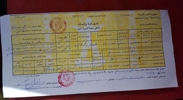 تداول رواد مواقع التواصل الاجتماعي صورة من شهادة وفاة قتيل الرحاب، مصطفى محمد مصطفى، الذي لقي مصرعه برصاص أمين شرطة بإدارة النجدة، الثلاثاء الماضي 19 أبريل، قرب مدينة الرحاب بالتجمع الأول، بسبب الخلاف على ثمن كوب شاي.