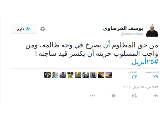 أشاد الشيخ يوسف القرضاوي، رئيس الاتحاد العالمي لعلماء المسلمين، بالدعوات المطالبة بالتظاهر اليوم 25 إبريل، وقال: “من حق المظلوم أن يصرخ في وجه ظالمه”.