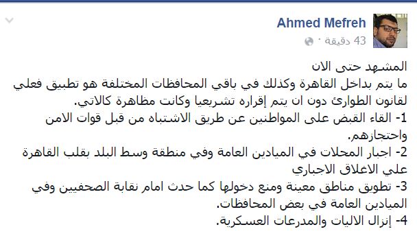 وقال -عبر منشور له على “فيسبوك”-: إن من مظاهر تطبيق قانون الطوارئ: