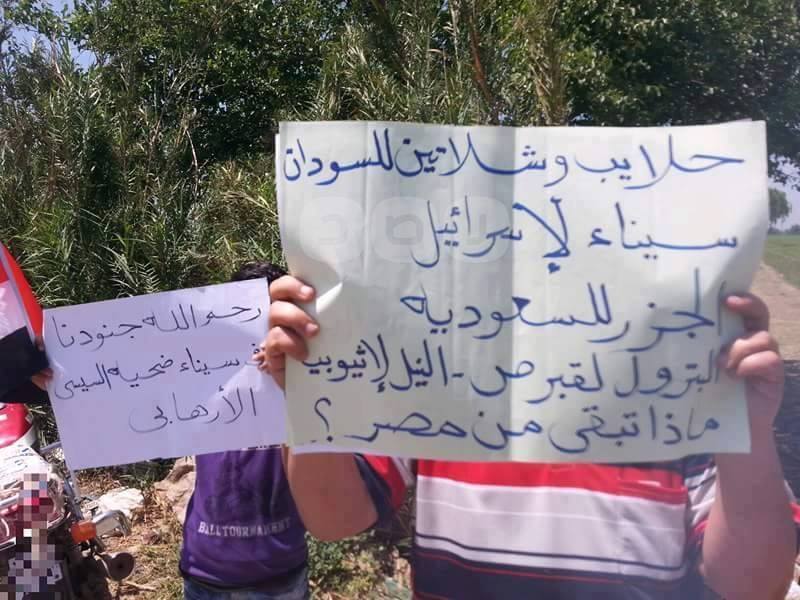 رفع خلالها المشاركون أعلام مصر ولافتات مدونا عليها عبارات مناهضة لبيع الجزيرتين ومطالبين بإسقاط حكم العسكر.