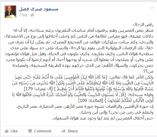 قال مسعود صبري فضل، الكاتب والباحث بقسم الشريعة بكلية دار العلوم، إن “منظر بعض المصريين وهم يرقصون أمام شاشات التليفزيون برغم سذاجته، إلا أن له دلالات عميقة؛ فهو مقياس لطائفة من الناس كم وصلت أخلاقها إلى نوع من الاضمحلال والتردي، وكم ساءت سلوكيات طوائف من المجتمع المصري”.