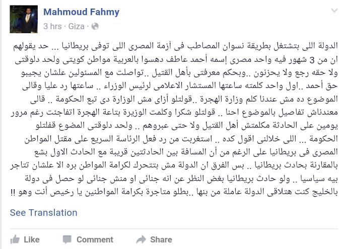 وقال الصحفي محمد فهمي: “الدولة اللى بتشتغل بطريقة نسوان المصاطب فى أزمة المصرى اللى توفى بريطانيا … حد يقولهم ان من 3 شهور فيه واحد مصرى إسمه أحمد عاطف دهسوا بالعربية مواطن كويتى ولحد دلوقتى ولا حقه رجع ولا يحزنون ..وبحكم معرفتى بأهل القتيل ..تواصلت مع المسئولين علشان يجيبو حق أحمد ..اول واحد كلمته ساعتها المستشار الاعلامى لرئيس الوزراء .. ساعتها رد عليا وقالى الموضوع ده مش عندنا كلم وزارة الهجرة ..قولتلو أزاى مش الوزارة دى تبع الحكومة .. قالى معندناش تفاصيل بالموضوع احنا .. قولتلو شكرا وكلمت الوزيرة بتاعة الهجرة اتفاجئت رغم مرور يومين على الحادثة مكلمتش أهل القتيل ولا حتى عبروهم .. ولحد دلوقتى الموضوع قفلتلو الحكومة”.