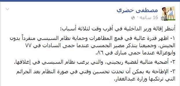 وقال -عبر منشور له على “فيس بوك”-: “أنتظر إقالة وزير الداخلية في أقرب وقت لثلاثة أسباب:
