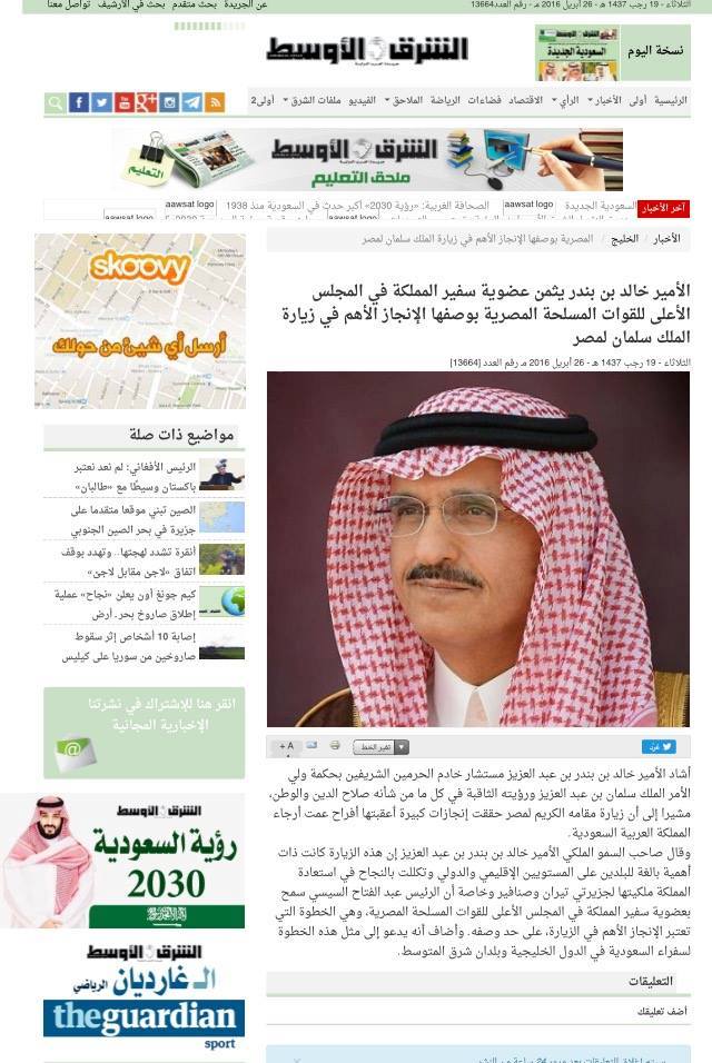 تداول رواد مواقع التواصل الاجتماعي، خبرًا منشورًا على موقع الشرق الأوسط، يفيد بعضوية سفير المملكة في المجلس الأعلى للقوات المسلحة المصرية.