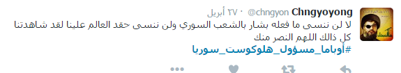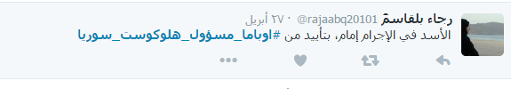وأطلق معارضون سوريون وسماً بعنوان #أوباما_مسؤول_هلوكوست_سوريا على موقع التواصل الاجتماعي “تويتر”، الأربعاء، في إشارة إلى الدور السلبي الذي تؤديه الولايات المتحدة الأمريكية في إدارة الملف السوري.