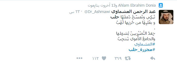وقال الشاعر السعودي عبد الرحمن العشماوي: “تبكي وتمسح دمعها حلب وبقلبها من حزنها لهب”.