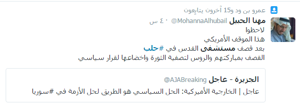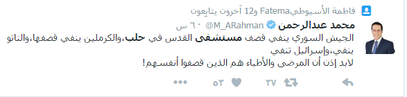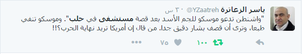 وقال الكاتب ياسر الزعاترة: “واشنطن تدعو موسكو للجم الأسد بعد قصة مستشفى حلب وموسكو تنفي طبعا وترى أن قصف بشار دقيق جدا من قال إن أمريكا تريد نهاية الحرب؟”