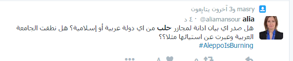 وقالت عاليا: “هل صدر اي بيان ادانة لمجازر حلب من اي دولة عربية او اسلامية؟”.
