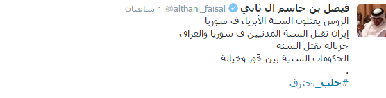 وقال الكاتب فيصل بن جاسم ال ثاني، وأحد شيوخ الأسرة الحاكمة بقطر:”الروس يقلون السنة الابرياء في سوريا.. الحكومات السنية بين خور وخيانة”.