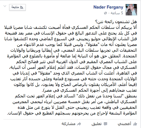 انتقد الدكتور نادر فرجاني، استاذ العلوم السياسية بجامعة القاهرة، طريقة تعامل السلطات المصرية مع حوادث مقتل المصريين في بريطانيا وأميركا وإيطاليا، محاولاً إثارة الشكوك بين ربط هذه الجرائم وانتقاد هذه الدول لأوضاع حقوق الإنسان في مصر عقب مقتل ريجيني.