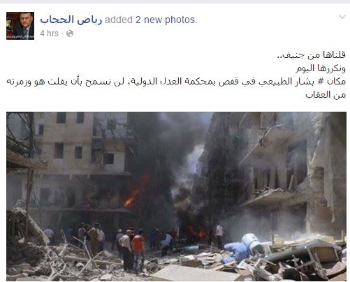 وقال حجاب في منشور له على صفحته بموقع التواصل الاجتماعي “فيسبوك”: “قلناها من جنيف.. ونكررها اليوم، مكان بشار الطبيعي في قفص بمحكمة العدل الدولية، لن نسمح بأن يفلت هو وزمرته من العقاب”.