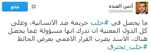 وقال العبدة -في تغريدة له عبر حسابه الرسمي على موقع “تويتر”-: “يحصل في حلب جريمة ضد الإنسانية، وعلى كل الدول المعنية أن تدرك أنها مسؤولة عما يحصل هناك، الأسد يضرب القرار الأممي بعرض الحائط حلب تحترق”.