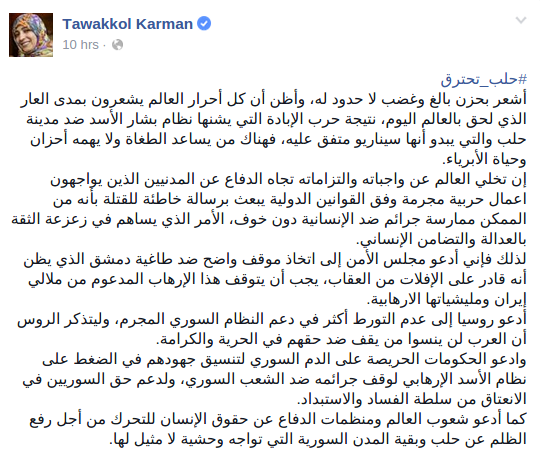 أعربت الناشطة اليمنية، توكل كرمان، الحائزة على جائزة نوبل، عن حزنها؛ نتيجة حرب الإبادة التي يشنها نظام بشار الأسد ضد مدينة حلب، مشيرة إلى أن هذا سيناريو متفق عليه، فهناك من يساعد الطغاة ولا يهمه أحزان وحياة الأبرياء، على حد قولها.