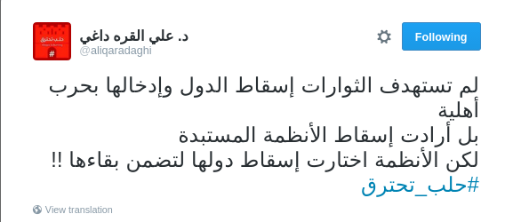 وقال -عبر تغريدة له عبر على “تويتر”-: “لم تستهدف الثورات إسقاط الدول وإدخالها بحرب أهلية، بل أرادت إسقاط الأنظمة المستبدة، لكنَّ الأنظمة اختارت إسقاط دولها لتضمن بقاءها”، مذيلاً تغريدته بهاشتاج “حلب تحترق”.