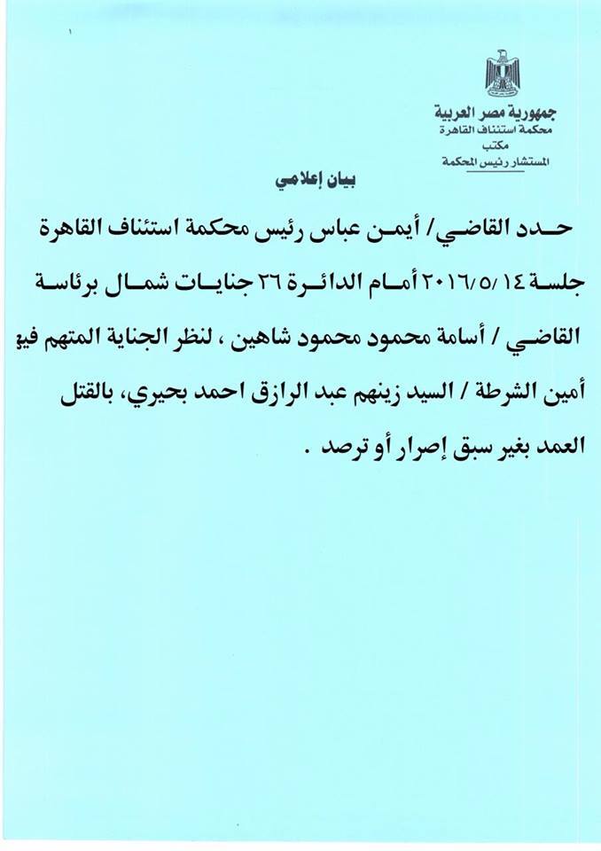 وكان النائب العام المستشار نبيل صادق أمر بإحالة أمين الشرطة قاتل بائع بمنطقة الرحاب إلى محاكمة عاجلة بمحكمة الجنايات بتهمة القتل العمد والشروع في القتل العمد والإتلاف العمدي؛ بسبب رفض المتهم لدفع ثمن “كوب شاي”.