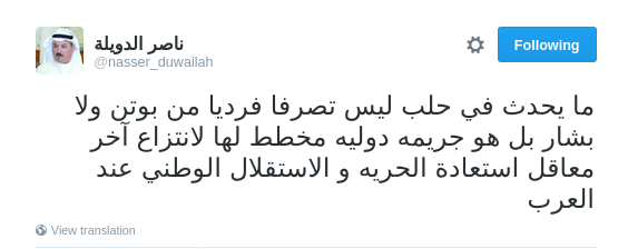 استنكر السياسي الكويتي ناصر الدويلة القصف الذي تعرضت له مدينة حلب السورية خلال الأيام الماضية، ووصفه بأنه “جريمة دولية مخطط لها”.