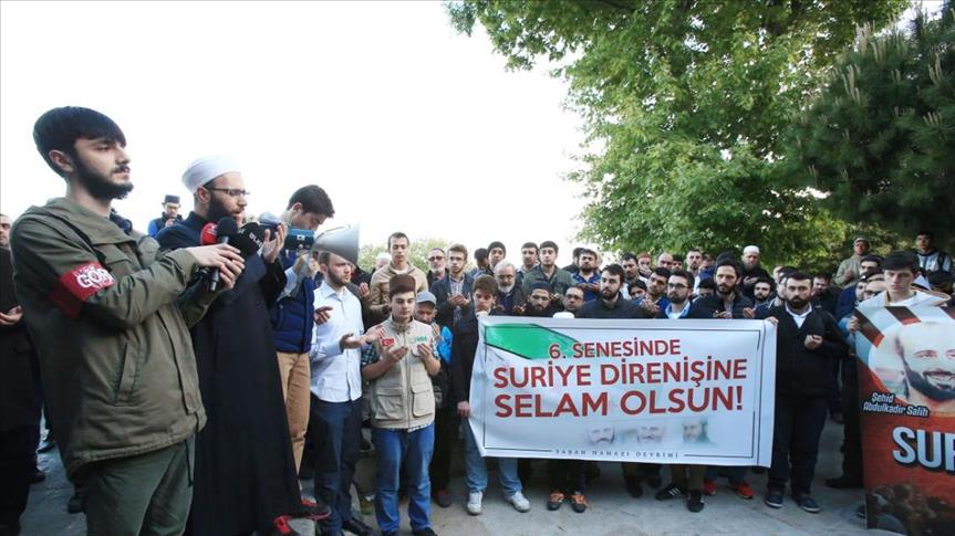 ورفع المشاركون في الفعالية -حسب “الأناضول”- لافتات في حرم المسجد، كُتب عليها “تحية للمقاومة السورية في عامها السادس”، و”نحن إلى جانب الشعب السوري المقاوم”، و”المستقبل للإسلام”.