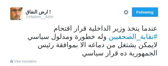 وقال -عبر تغريدة له على “تويتر”-: “عندما يتخذ وزير الداخلية قرار اقتحام نقابة الصحفيين، وله خطورة ومدلول سياسي، لا يمكن يشتغل من دماغه إلا بموافقة رئيس الجمهورية، ده قرار سياسي”.