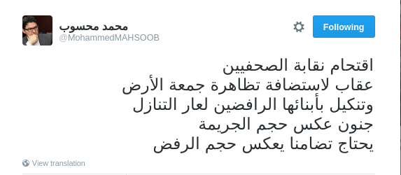 وقال -عبر تغريدة له على “تويتر”-: “اقتحام نقابة الصحفيين عقاب لاستضافة تظاهرة جمعة الأرض وتنكيل بأبنائها الرافضين لعار التنازل، جنون عكس حجم الجريمة يحتاج تضامنًا يعكس حجم الرفض“.