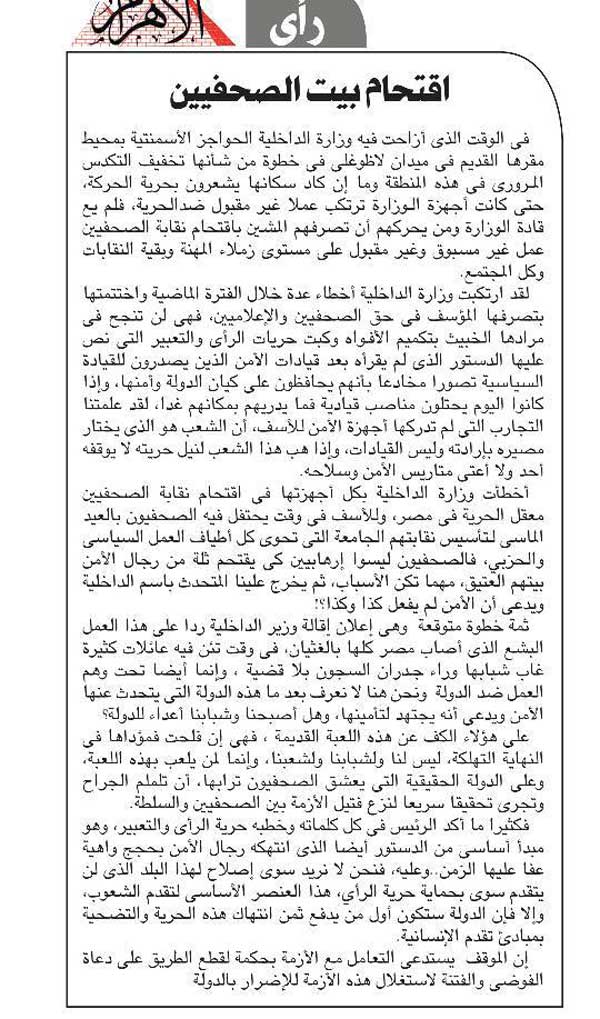 وجاء “رأي الأهرام” في عددها الصادر اليوم الثلاثاء، تحت عنوان “اقتحام بيت الصحفيين”، حاملًا رسالة قوية حول رفض ما فعلته وزارة الداخلية، وكيف أن بعض قادتها يصورون للقيادة السياسية أنهم بذلك يحمون أمن الدولة.