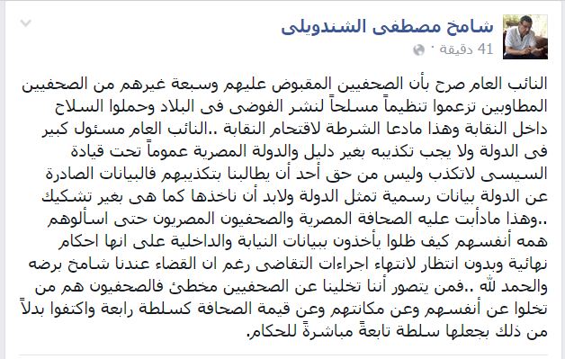 وأضاف -عبر منشور له على “فيس بوك”- أن الصحافة المصرية دأبت على نشر بيانات الدولة على أنها حقائق دون تشكيك، كبيان النائب العام الذي قال إن المعتقلين الصحفيين تنظيم مسلح.