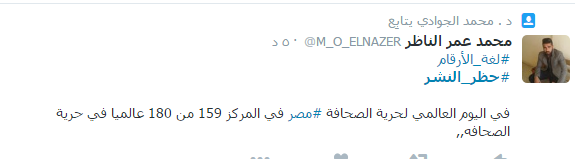 وغرد محمد عمر: “في اليوم العالم لحرية الصحافة مصر في المركز 159 من 180 عالميا في حرية الصحافة”.