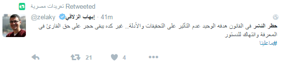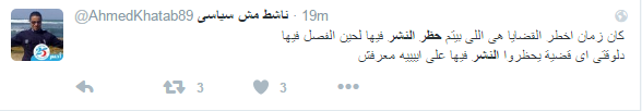 وقال آخر: “كان زمان أخطر القضايا هي اللي بيتم فيها حظر النشر لحين الفصل فيها دلوفي اي قضية يحظروا النشر فيها”.
