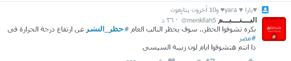 وسخر أحد المغردين: “بكره تشوفوا الحظر.. سوف يحظر النائب العام حظرالنشر عن ارتفاع درجة الحرارة في مصر دا انتم هتشوفوا أيام لون زبيبة السيسي”.