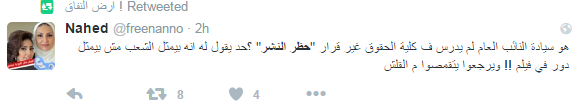 وقالت ناهد: “هو سيادة النائب العام لم يدرس في كلية الحقوق غير قرار “حظر النشر” حد يقوله إنه بيمثل الشعب مش بيمثل دور في فيلم”.