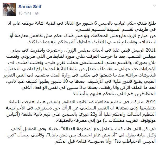 وحكمت محكمة جنح السيدة زينب، بالحبس ستة شهور مع النفاذ ، على الناشطة السياسية “سناء سيف”، على خلفية إتهامها بإهانة القضاء.