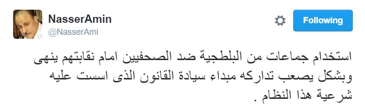 وقال -عبر منشور له على “تويتر”-: “استخدام جماعات من البلطجية ضد الصحفيين أمام نقابتهم ينهي وبشكل يصعب تداركه مبدأ سيادة القانون الذي أسست عليه شرعية هذا النظام”.