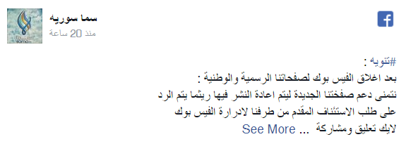 قامت إدارة موقع “فيس بوك”، بحذف الصفحة الرسمية لرئاسة الجمهورية العربية السورية، وحذف الصفحة الرسمية لبشار الأسد وقناة “الميادين” وقناتي “الدنيا” و”سما” التابعتين لنظام الأسد.
