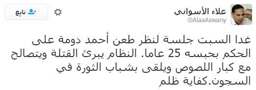 وأضاف في تغريدة أخرى: “غدا السبت جلسة لنظر طعن أحمد دومة على الحكم بحبسه 25 عاما، النظام يبرئ القتلة ويتصالح مع كبار اللصوص ويلقي بشباب الثورة في السجون، كفاية ظلم”.