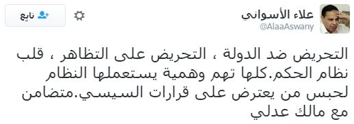 وقال الأسواني -في تغريدة له عبر حسابه الرسمي على موقع “تويتر”-: “التحريض ضد الدولة، التحريض على التظاهر، قلب نظام الحكم، كلها تهم وهمية يستعملها النظام لحبس من يعترض على قرارات السيسي، متضامن مع مالك عدلي”.