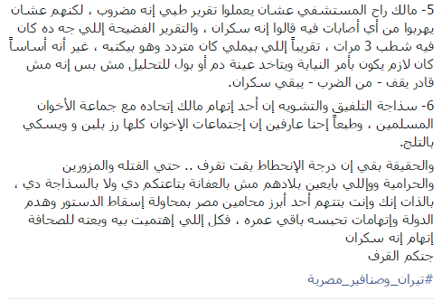 5- مالك راح المستشفي عشان يعملوا تقرير طبي إنه مضروب ، لكنهم عشان يهربوا من أي أصابات فيه قالوا إنه سكران ، والتقرير الفضيحة إللي جه ده كان فيه شطب 3 مرات ، تقريباً إللي بيملي كان متردد وهو بيكتبه ، غير أنه أساساً كان لازم يكون بأمر النيابة ويتاخد عينة دم أو بول للتحليل مش بس إنه مش قادر يقف – من الضرب – يبقي سكران.